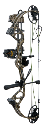 Includes Whisker Biscuit rest, 4 pin sight, Mossy Oak ®Bottomlands 5 arrow quiver, stabilizer, peep sight, and wrist sling