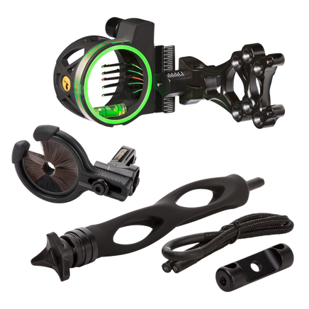 The Master Hunter Kit includes a Volt 5-pin sight with ultra-bright horizontal .019 fiber optic pins, 6" Static Stabilizer with two customizable weights, Kill Shot Whisker Biscuit with windage and elevation adjustments and a high-quality wrist sling and mounting bar.