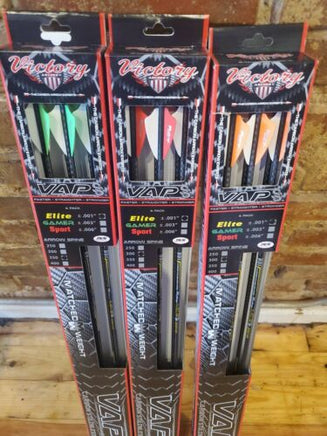 | The Victory Vap-SS Elite line of arrow shafts is a micro diameter shaft with stainless steel layers infused into a 90 degree carbon fiber weave arrow that is lighter and faster with a higher FOC designed with accuracy and increased penetration. Features advanced 3K carbon weave for less torque, faster recovery, and tighter spine consistency. Has advanced Nano ceramic arrow coating that improves penetration and easy arrow removal. Straightness tolerance of +- .001” and weight tolerance of +- 0.5 grains. Available in sizes 250 (10.8) 300 (9.9 GPI), 350 (9.0 GPI), 400 (8.5 GPI). IP nocks and Shok TL aluminum inserts included. Factory fletched with 2” vanes. |